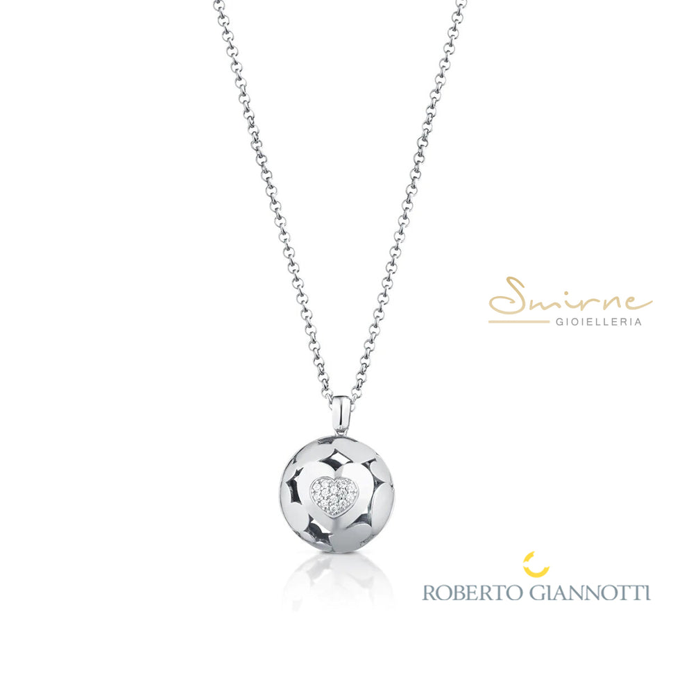 Pendente a forma di sfera traforata, con cuore centrale realizzato con zirconi bianchi
