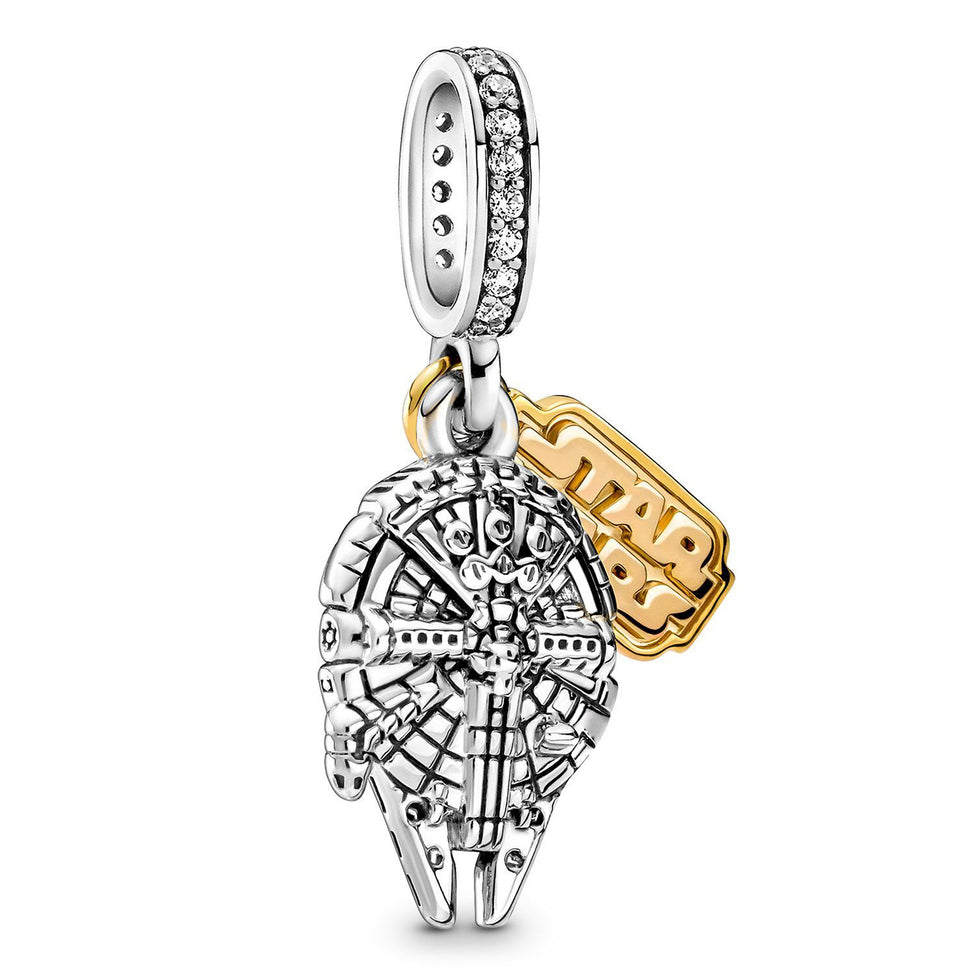 Tieni la Forza sempre accanto a te indossando questo charm pendente Star Wars™ Millennium Falcon™. Rifinito a mano e realizzato in Argento Sterling 925 e metallo con placcatura in Oro 14K, il charm bicolore della serie Star Wars è pieno di spirito della galassia. Un pendente raffigura la nave spaziale Millennium Falcon, completa di intricati dettagli tecnici, mentre l’altro pendente presenta una targhetta con il logo Star Wars su un lato e l’incisione “Never tell me the odds”(Non dirmi mai le probabilità) sull’altro lato.