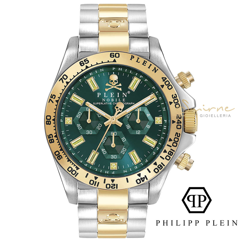 - quadrante verde con indici baguette e logo Plein con teschio dorato ore 12